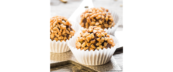 150 g Sahne • 50 g Butter • 100 g weiße Kuvertüre • 150 g Vollmilchkuvertüre • 50 g gehackte Pistazien • 30 g Haselnusskrokant • 30 g Mandelstifte • Haselnusskrokant zur Dekoration