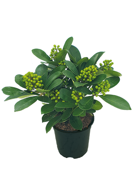 Die Japanische Skimmie (Skimmia japonica 'Veichtii') ist ein kompakt wachsender immergrüner Kleinstrauch. Seine dekorativen, roten Früchte bleiben sehr lange haften. Weiße, wohl duftende Blüten erscheinen im Mai an Rispen und eignen sich sehr gut für den Vasenschnitt. Auch die Blätter duften leicht. Diese Skimmie eignet sich sowohl solitär als auch für eine Heckenpflanzung.