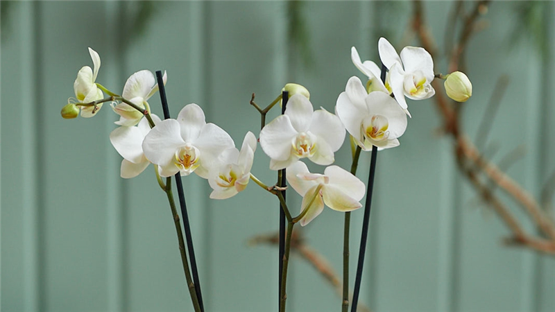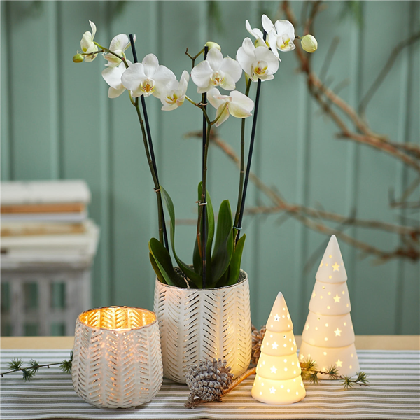 Kleine weiße LED-Bäume in unterschiedlichen Größen finden überall einen dekorativen Platz. Besonders winterlich wirken sie als Paar platziert. Der grün-weiß gestreifte Tischläufer bildet die perfekte Basis jedes Weihnachtsarrangements auf dem Tisch. Elegante Akzente setzen die Blütenfarben der Schmetterlingsorchidee (Phalaenopsis-Hybride) in Weiß, Gelb, Rosa, Violett und gezeichneten Blüten. Ihre drei Triebe erheben sich grazil aus dem wunderschönen Übertopf. Das gold-weiße Windlicht aus Glas setzt glänzende Akzente. Wer möchte, kann das Windlicht auch als Übertopf für seine Lieblingspflanzen verwenden.